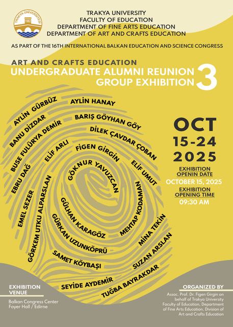 The Department of Art and Craft Education at the Faculty of Education, Trakya University, will organize a meaningful event as part of the 16th International Balkan Education and Science Congress, which will be hosted by the Faculty of Education between October 15-17, 2025. This year marks the third edition of the “UNDERGRADUATE ALUMNI REUNION” group exhibition, where unique artworks created by undergraduates and academic staff of the Department of Art Education will be presented to art enthusiasts.